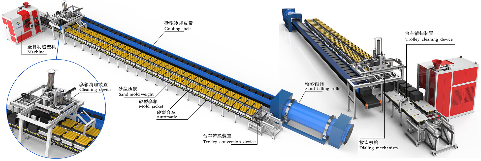 The fully automatic horizontal parting molding production line for wet sand (green sand) casting mainly consists of three major areas: the forming area, the pouring area, and the cooling area;